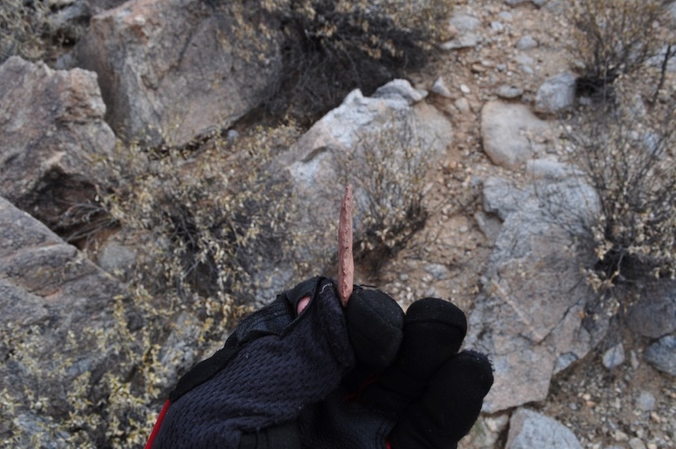 Update from Ranger: "The general consensus of 3 separate archaeologists was that it is an Archaic point (which is what I thought), specifically a San Pedro point (Late Archaic). There are different dates for the San Pedro period of the Cochise culture (the term for the Archaic people in this area). These range from 3500BP-1800BP (BP is Before Present – not to be confused with BC). So, in plainer English, maybe 1500BC to 200-300AD. But it is definitely pre-Hohokam. This is a very important find, as we attribute some of the petroglyphs to the Archaic culture, but to my knowledge there have been no definitive points or other artifacts that can be attributed to the Archaic (until now!). "