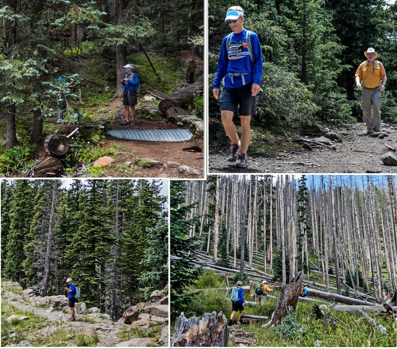 on the trail.  UL is at the lower end of the trail, one of the bridge crossings.  LL is at a little saddle before the last 500 feet or so of up.  This is where Kelly began my elevation countdown.  She is working with HAZel.  UR is as they came back from the Summit, I rested.  LR is walking through the matchsticks section; so incredible.