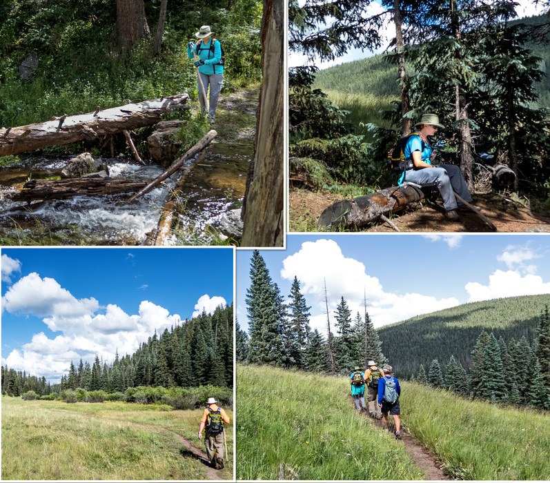 one last people picture. Mary Jo sizing up the log she would balance beam across. UR she is taking a good long swig of water before we continue our journey. LL is Wade walking on the trail to the other side of the fence rather than taking the route on the left. The river is to our right. It looks like on the map if you follow this rather than take the trail back to the route, it would take you out to parking at Sheep's Crossing but I'm not sure. LR continuing our meadow walking.