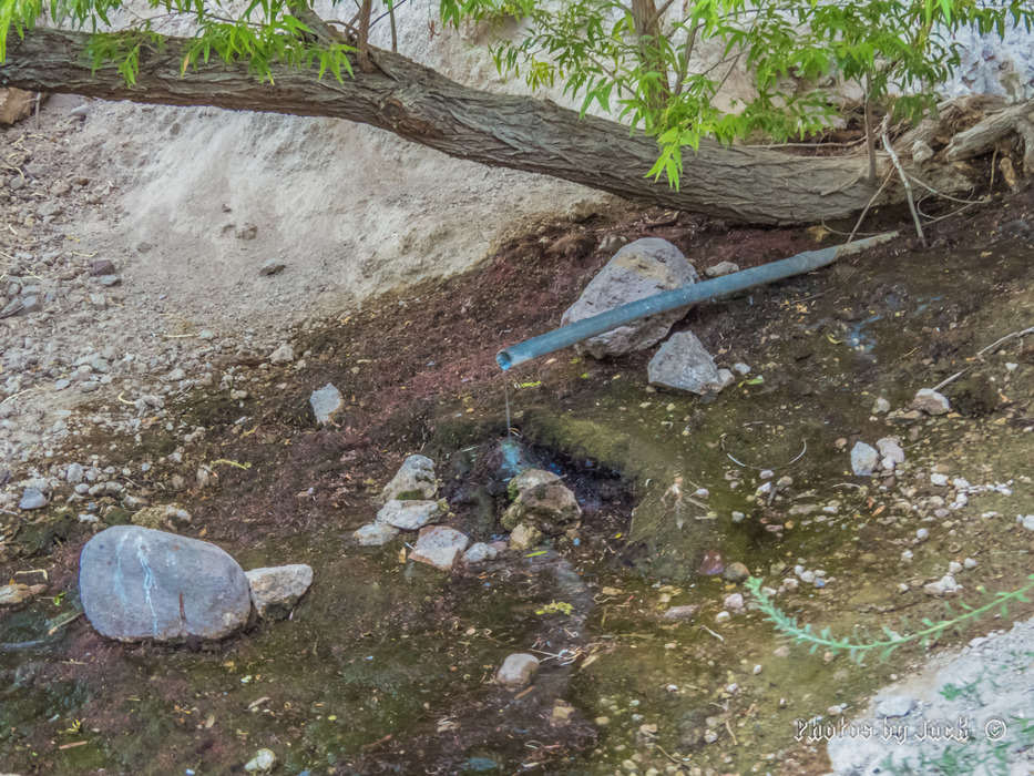 A small trickle of water flows from the pipe coming from deep inside the spring.