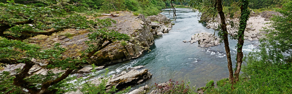 a goofy pano I put together: The Colliding Rivers is the name of the confluence of Little River into the North Umpqua River at Glide, Oregon, approximately 12 miles east-northeast of Roseburg. It is known as Colliding Rivers because of the nearly head-on angle at which the streams meet, the only place in the state of Oregon where a river meets its tributary in such a straight angle. Prior to the point of the Colliding Rivers, the Little River approaches from the south and the North Umpqua has completed a sharp bend and intersects the Little River.