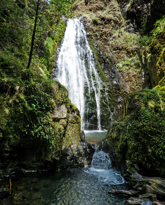 and just so you know; if you ever do this hike, they actually have a picnic table here. Anyway, there she is. Susan Creek Falls; a worthy destination. We were lucky to have the falls in full light. Susan Creek Falls is the first significant waterfall along the Umpqua River east of Glyde. A fairly easy .8 mile trail takes you to the base of this 50 foot waterfall. You can get up close to this waterfall if you wish. Large moss covered boulders lie at the base of the falls.
