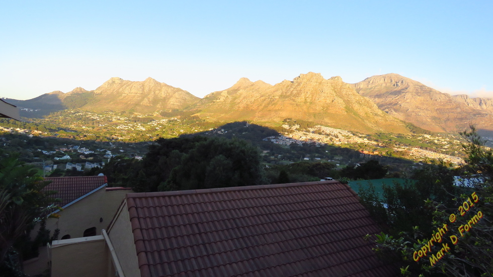 View over Hout Bay from Mount Rhodes Drive. We are staying in a cabin in the dark green area near the top left.