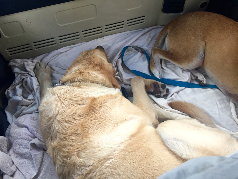 I like to hike so much that I get tired and sleep on the way home. I also like cars with black carpet because it's fun to shed my fur there.