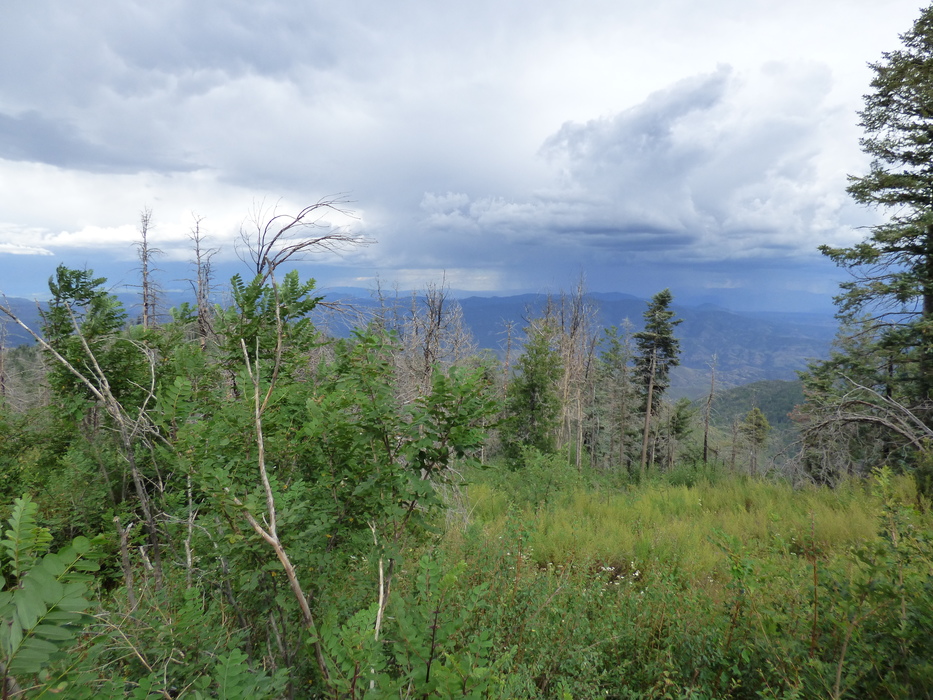 a hard-won view atop Blue Peak. Brush in the foreground, storms behind