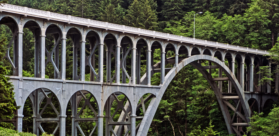 from wiki: Cape Creek Bridge is an arch bridge that spans Cape Creek in Lane County, Oregon, United States. The bridge carries U.S. Route 101. Opened in 1932, it was designed by noted bridge engineer Conde McCullough and built of reinforced concrete by John K. Holt. The total length of the bridge is 619 feet, with a main span of 220 feet. The bridge resembles a Roman aqueduct, with a single parabolic arch that spans half its length. It was listed as Cape Creek Bridge No. 01113 on the National Register of Historic Places in 2005, as part of the McCullough, C.B., Major Oregon Coast Highway Bridges MPS (Multiple Property Submission).
