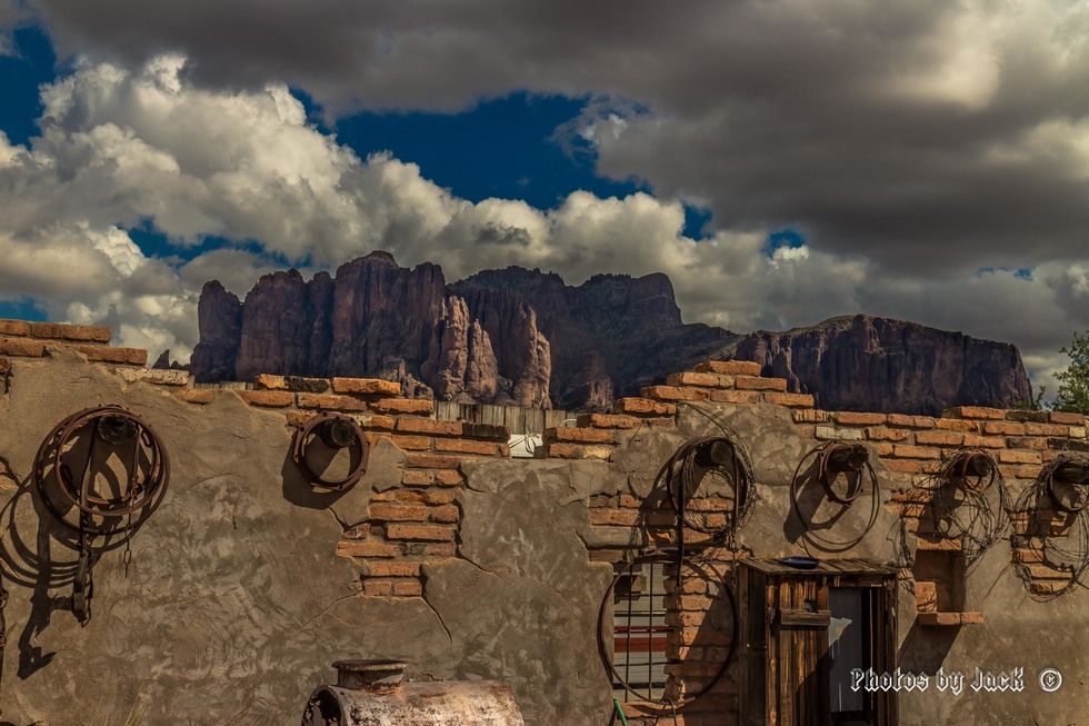 Aging stucco exposes the adobe block wall with the Superstitions in the background.