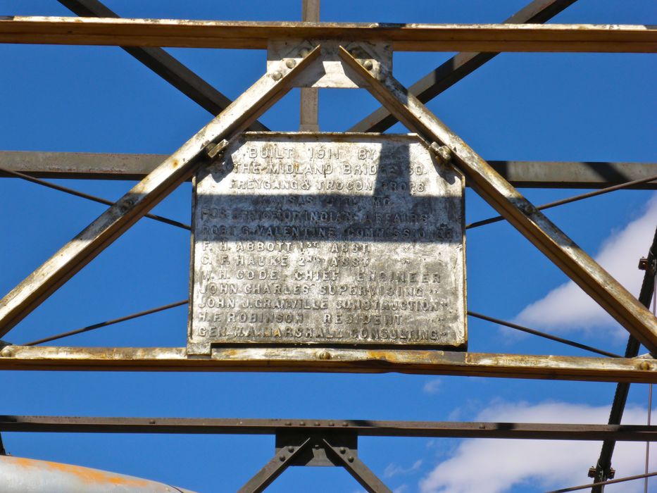 The old bridge sign, basically illegible to the naked eye: "Built 1911 by the Midland Bridge Co. Freygang and Trocon props. Kansas City Mo. For Office of Indian Affairs Robt. G. Valentine Commissioner. F.H. Abbott 1st Asst. C.F. Hauke 2nd Asst. W.H. Code Chief Engineer. John Charles Supervising -- old bridges have credits like modern movies!