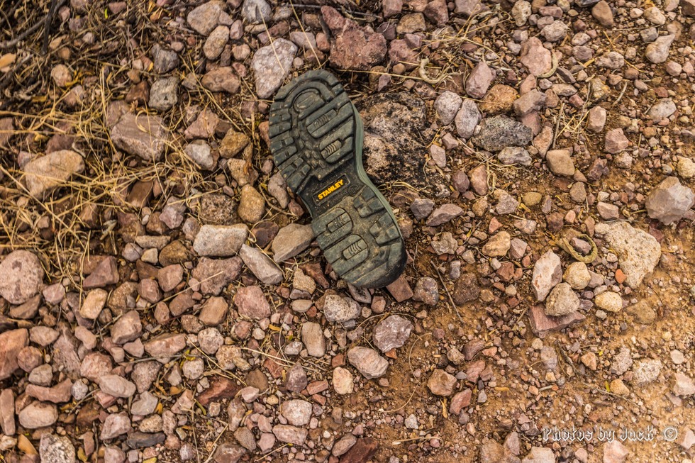 Lost & Found... I discovered this lying along the trail from the Saddle back to the Trailhead. Hope the guy had some duct tape along. Don't buy this brand for a hiking shoe, the tread was almost new but the upper shoe was missing.