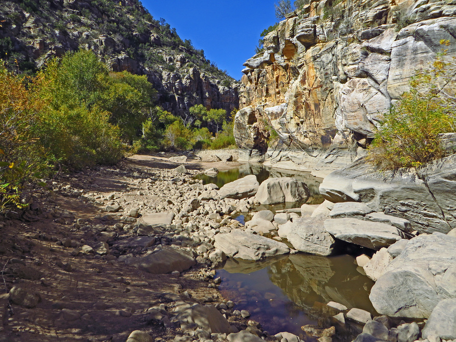 A nice, shaded, sandy beach rest/lunch location a short distance down canyon from Hamilton Crossing.