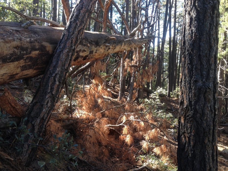 This behemoth came down within the last two weeks, according to a couple equestrians who ride the area frequently that we met on the trail. Too high for a saw, too big to mess with. It's a real dangerous one--maybe the FS will use explosives.