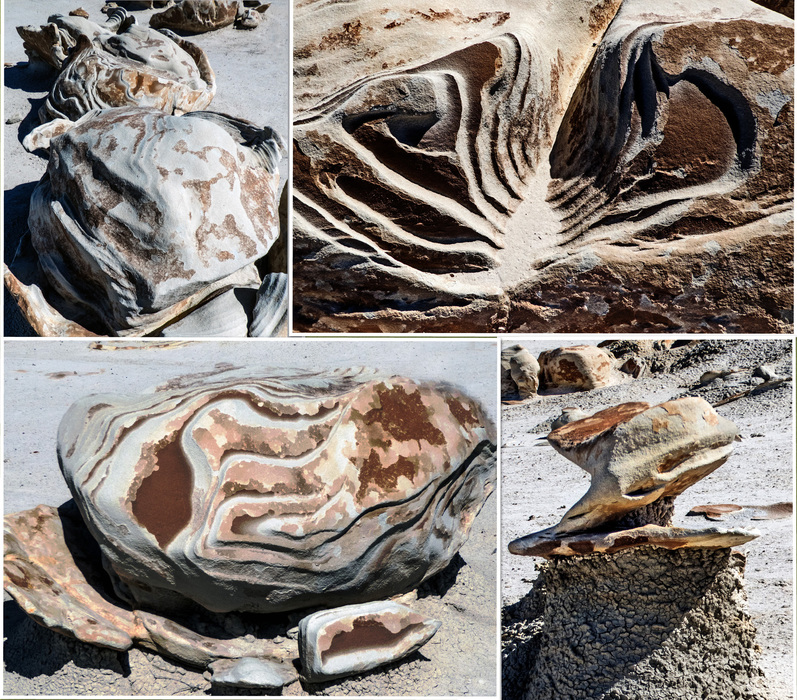 here is a Dinosaur Cracked Egg collage. These are remnants of limestone tubes that built up, as water carved channels through the volcanic ash. The limestone is harder than the ashy clay, so the tubes now lie on the floor of the wash, eroding into egg shapes.