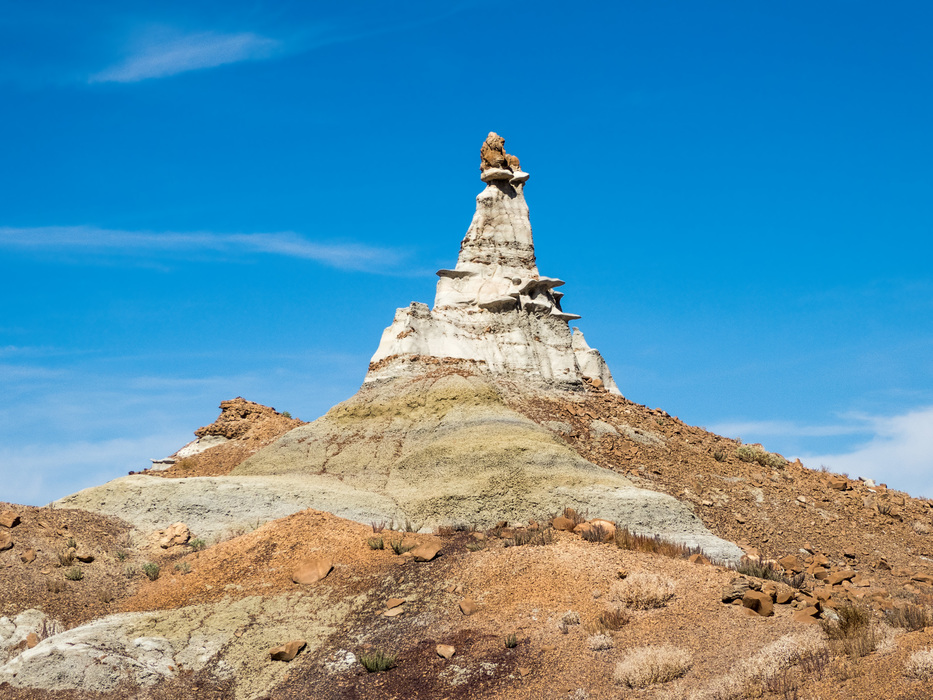 The Red Queen with a siltstone crown on top of ash. You can see how pillars will form as erosion continues to wash away the ash that is not protected by siltstone. The "Red Queen" is at the southern entrance to Wonderland. The Red Queen is probably ten or twelve feet from the red clinker to the brown siltstone.