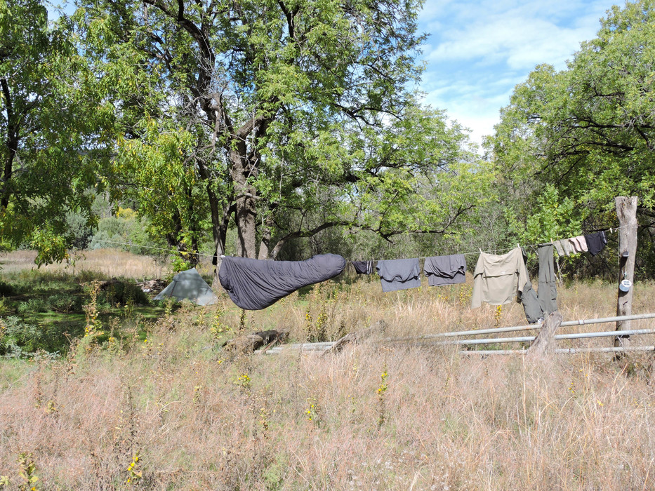 Got soaked Thursday afternoon when I got caught in a rainstorm without my rain gear while exploring the hillside on the east side of Reavis Ranch. My sleeping bag got slightly wet from condensation dripping off the roof of my tent. So Friday was a clothes drying day.