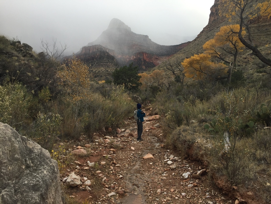 Claire admires some fog from Cottonwood Creek. Plenty of water available