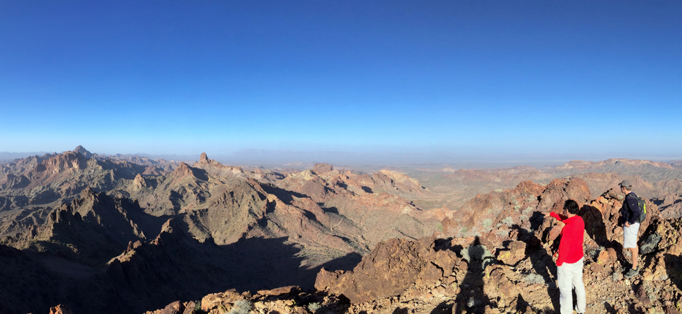 Bob and Dave take in summit views in the Castle Domes. A strong breeze all day kicked up some desert dust and limited long-range visibility.