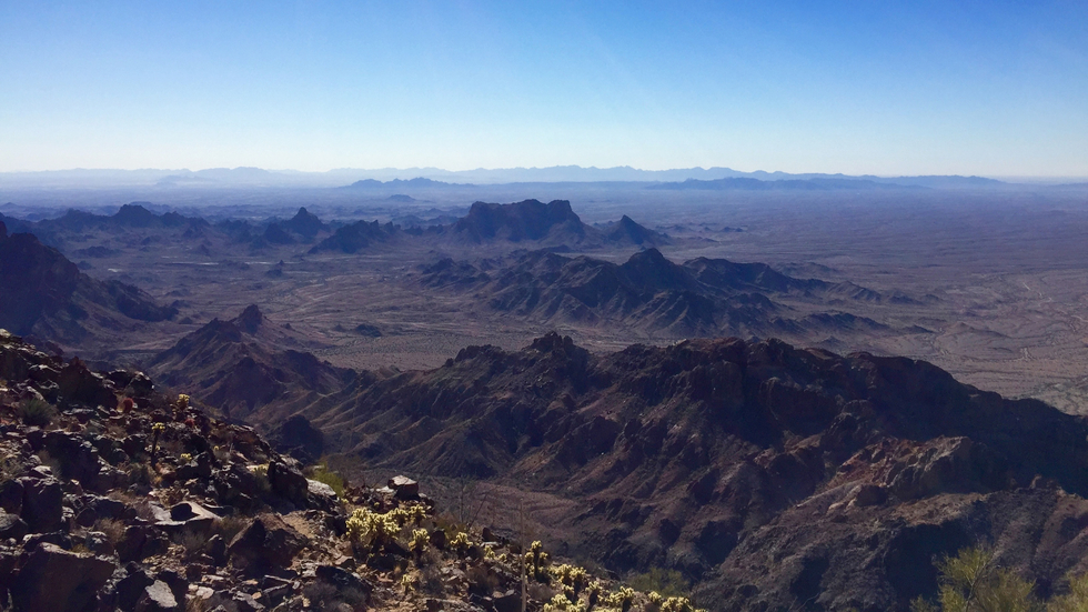 South toward Yuma. The distant mountains are the Gilas on the Goldwater Range. Mexico behind them.