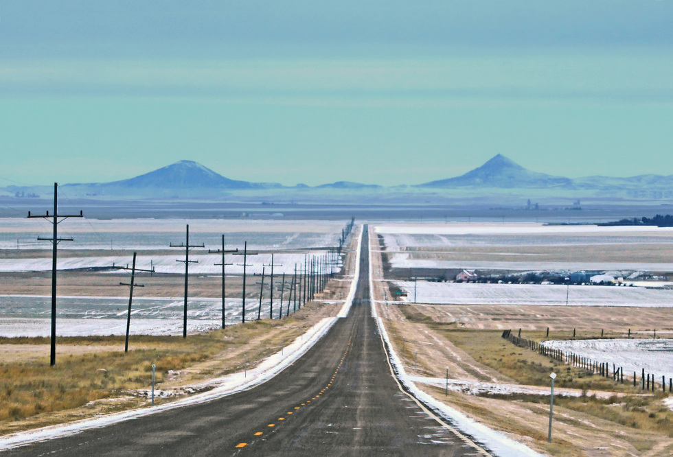 Heading down the hill toward Chester ;(on the right up there). Those are part of the Sweet Grass Hills ahead. Oh Canada is on the other side of them thar Hills.