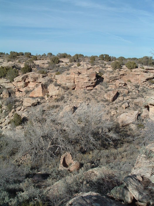 Looking across the canyon at another ruin, and Round Tower in the canyon bottom.