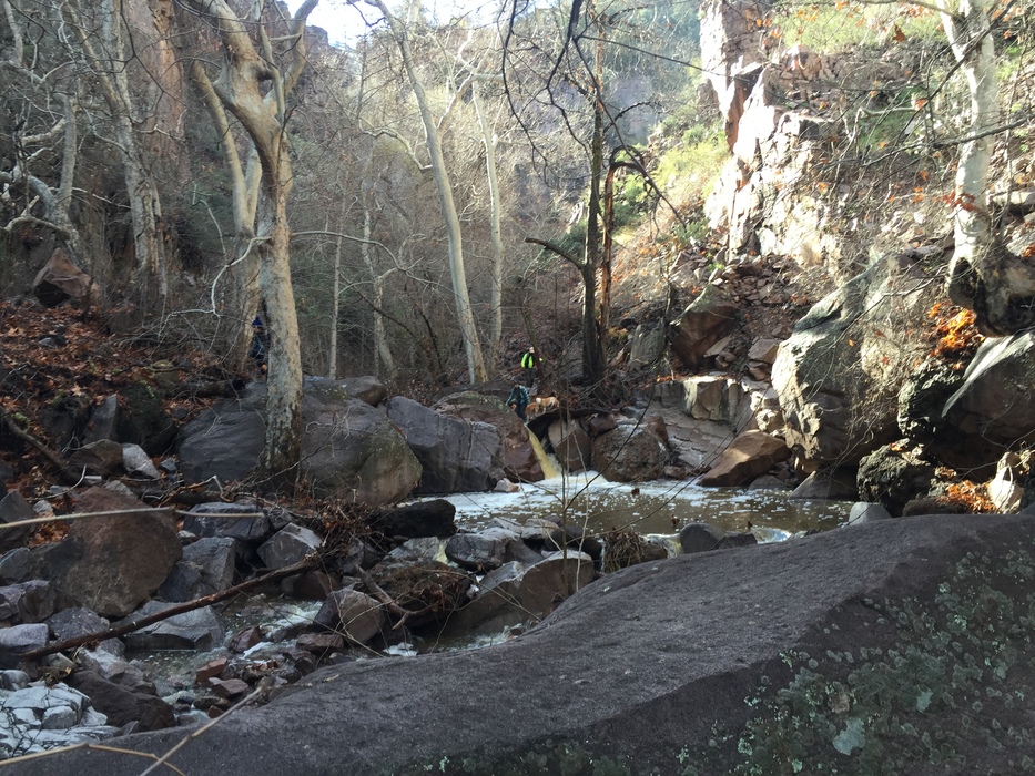 Liz and the dogs work their way down canyon