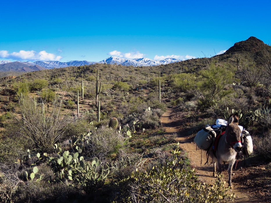 Just your every day mini-donkey hiking through the desert with snow-covered mountains in the background shot...