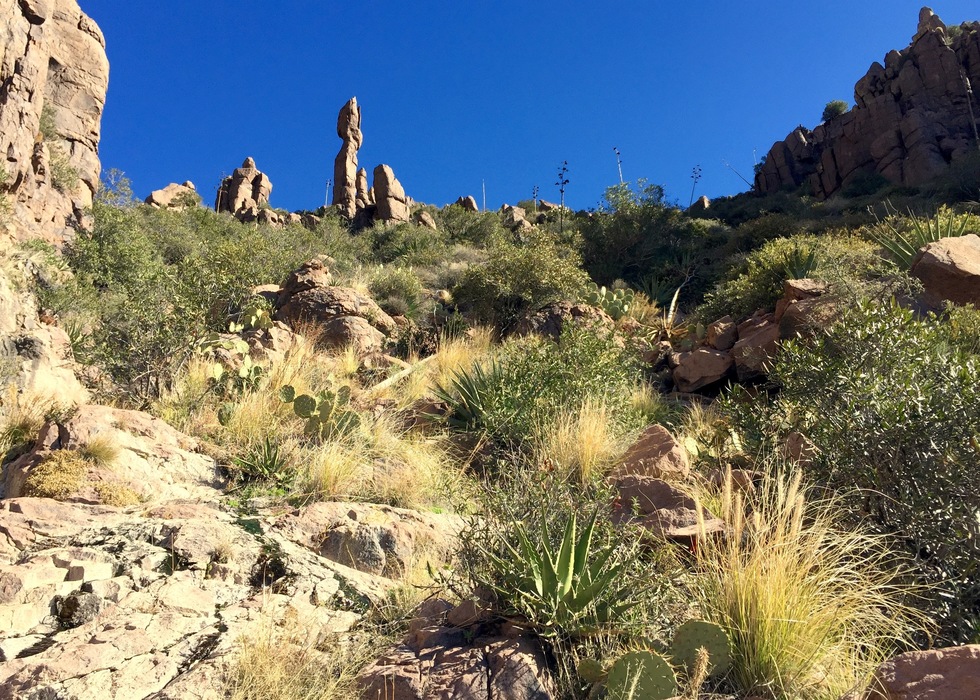 The drop from the shelf to the drainage was super dicey and took the best of my bouldering skills to overcome… but we reached the drainage at last. Once in the drainage, the Ridgeline was a hop, skip, and a jump [plus some cactus dodging] away.