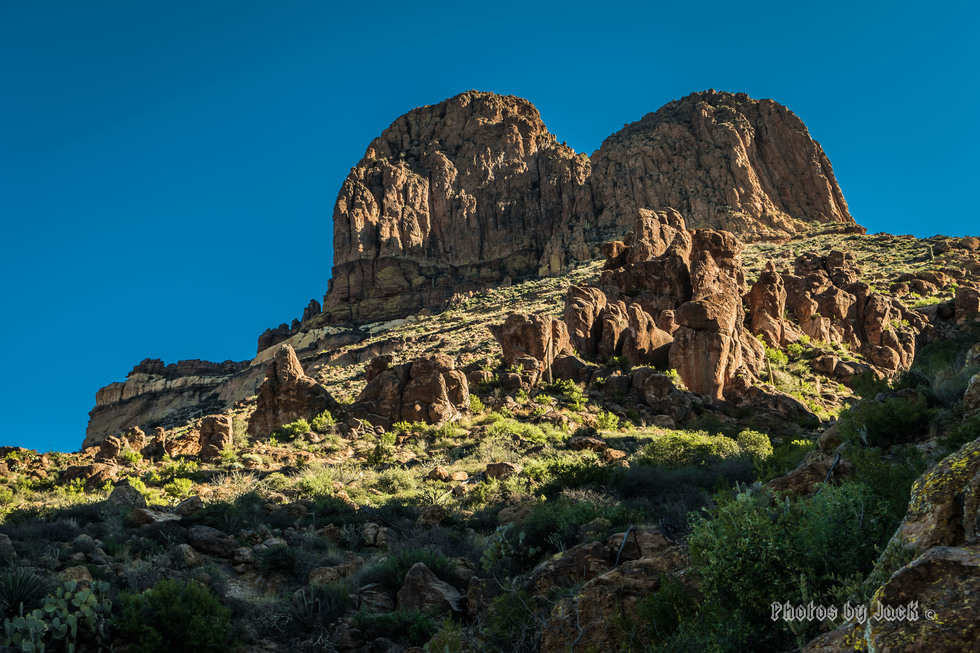 Following a cairned trail through the Hoodoos and rock strewn washes to the base of the Needle.