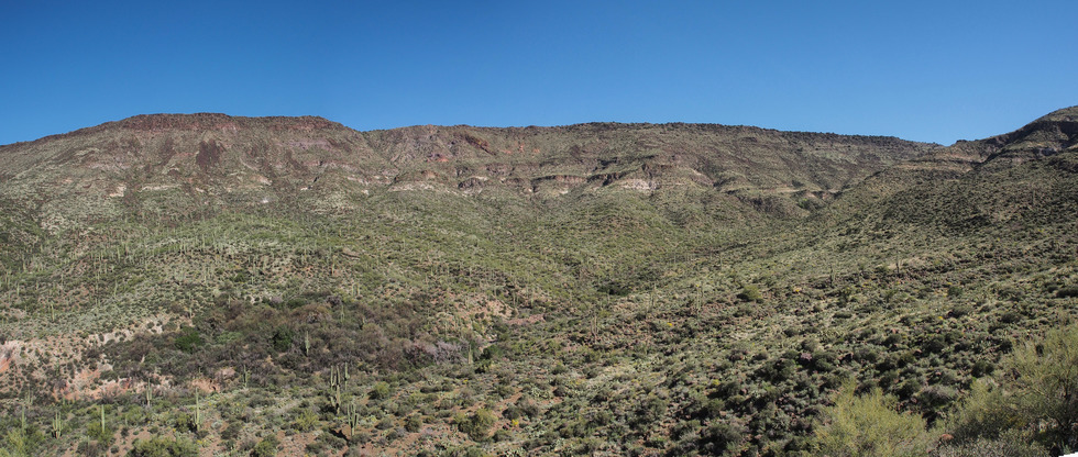 Panorama of the upper end of Cline Creek from a hilltop on the east side of the creek. Board Spring is somewhere down in that clump of brush and trees. I wanted to see if it had a developed water trough from ranching days but the brush was thicker than I wanted to deal with. There was no sign of water in the creek bed at the base of this brush hillside at the map location for the spring.
