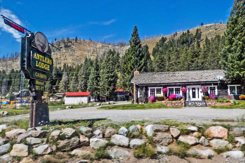 Cooke City's Antlers Lodge dating back to 1913. I love the colorful hanging baskets. Oh, we're back in Montana. You go back and forth 3 times getting into Yellowstone Park from Red Lodge.