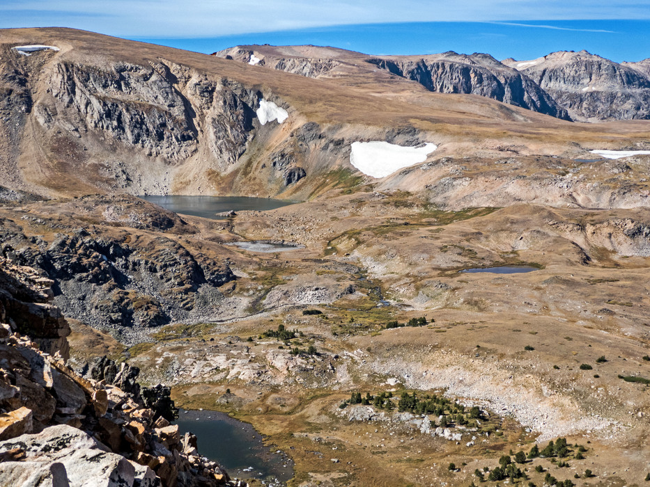 looking up from the Twin Lakes there are lots of little lakes and still snow left over from the winter. This is early September. The mountains have over 300 pristine lakes and some waterfalls in excess of 300 feet. Approximately 25 small glaciers exist in the Beartooths with Grasshopper Glacier being one of the more distinctive.