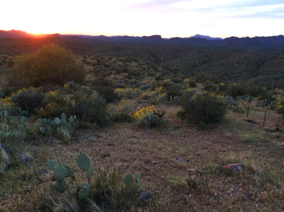 This sunset picture taken near the Gate along AZT section 18. The Superstition Mountains are peaking over the distance.