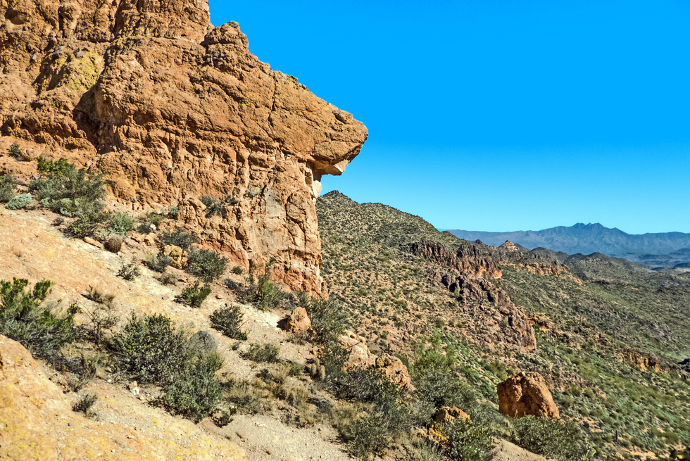 Here I am framing Panorama Peak with the golden rock of this mountain. Off to the right is the Golden Dome and Four Peaks.
