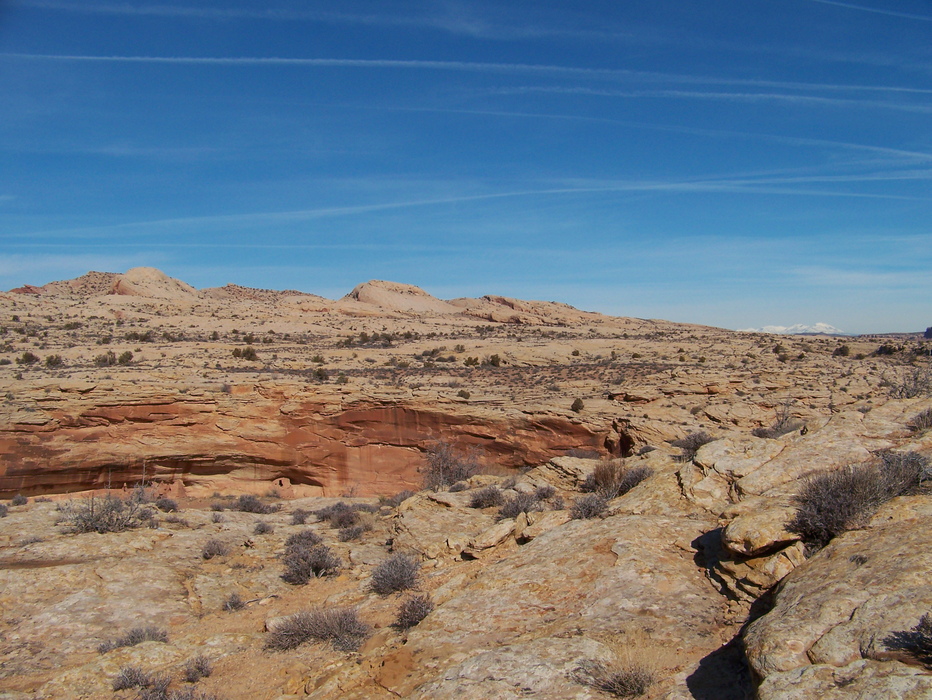 Cliff Dwelling in Butler Wash with the crest of Comb Ridge and the Abajos.