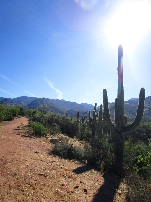 At the top of the stairs! Beautiful saguaros, some of which were pretty sizeable. Someone on the tour asked if they had been planted, and the ranger said no-- saguaros tend to grow mainly on the slopes of ridges so as to catch as much moisture as possible, the runoff as well as the direct fall of rain. These grew where their seeds had fallen in nature-- saguaros on utterly flat ground aren't as common, though they definitely occur.