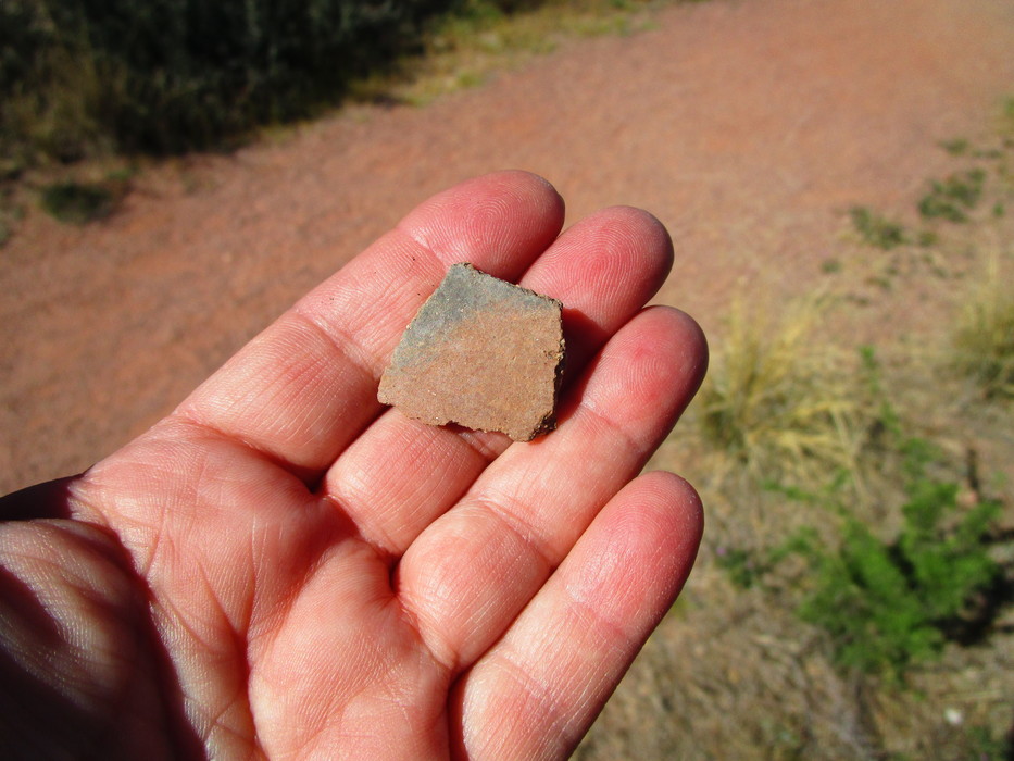 Pottery shard. The local stuff, I was told, was mostly plainware; painted pottery generally came from tribes inhabiting the area that is now Phoenix. So most of this stuff was very simple; some of it was extremely finely made, though, thin and beautifully burnished with polishing-stones until it gleamed even now.