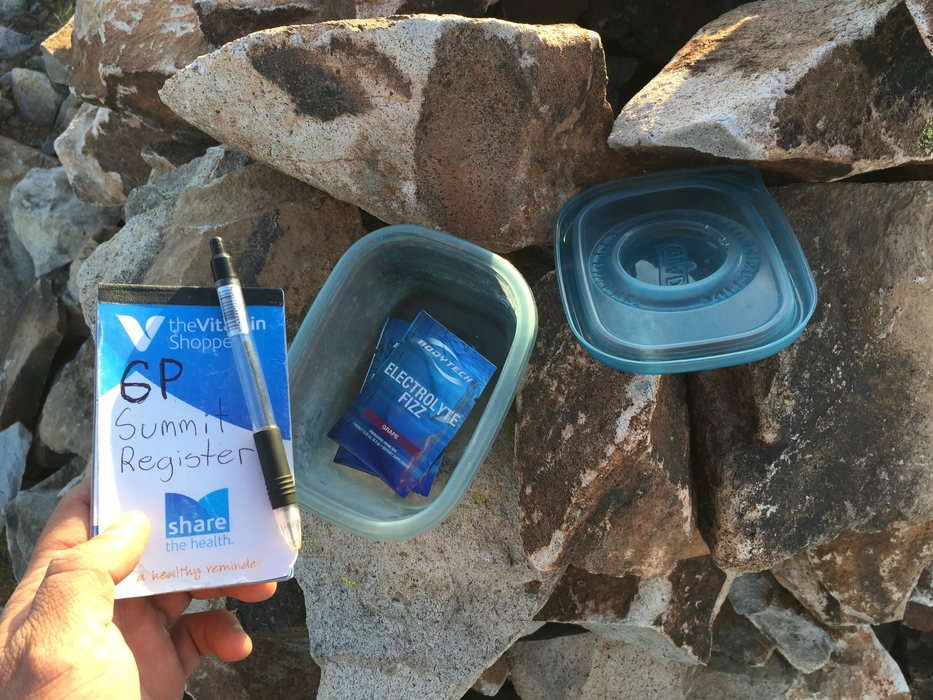 New official summit register along with some electrolytes for the next noble hiker to make the summit.
