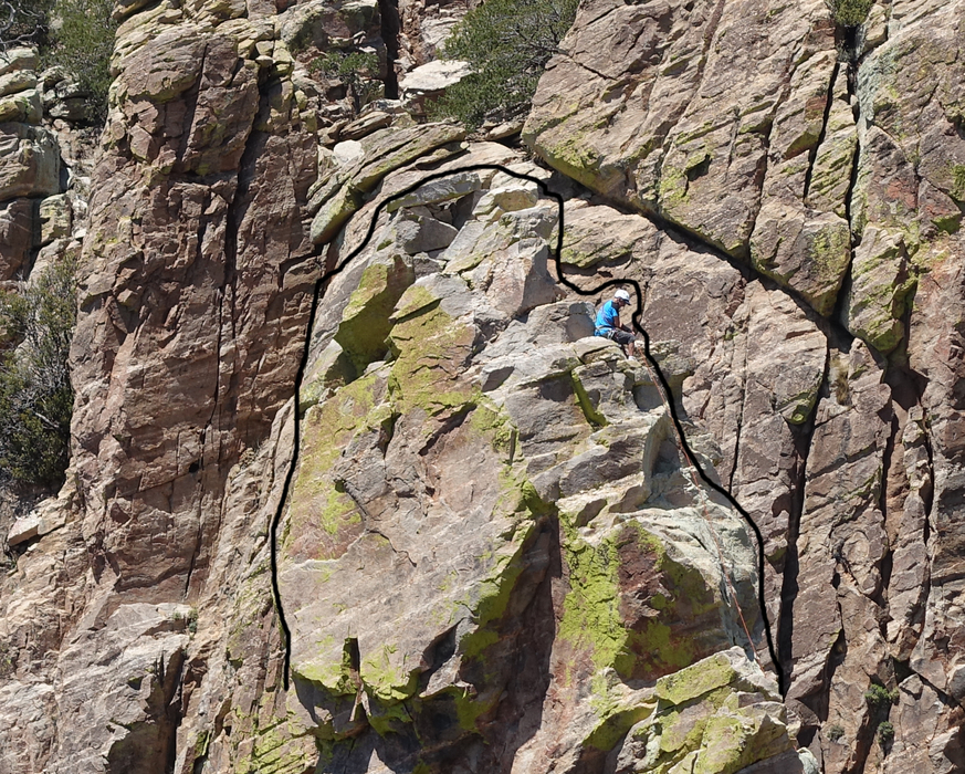 View from Finger Rock Guard, line shows outline of Finger Rock against Prominent Pt, and Mike at the top anchors