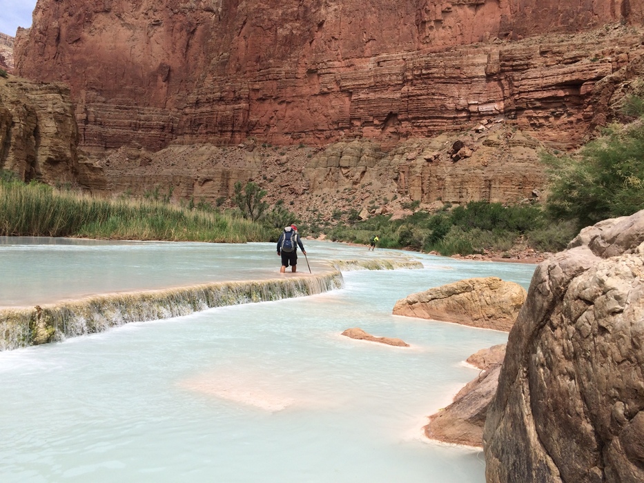 Crossing the travertine dams loaded down with two days' worth of water was interesting.