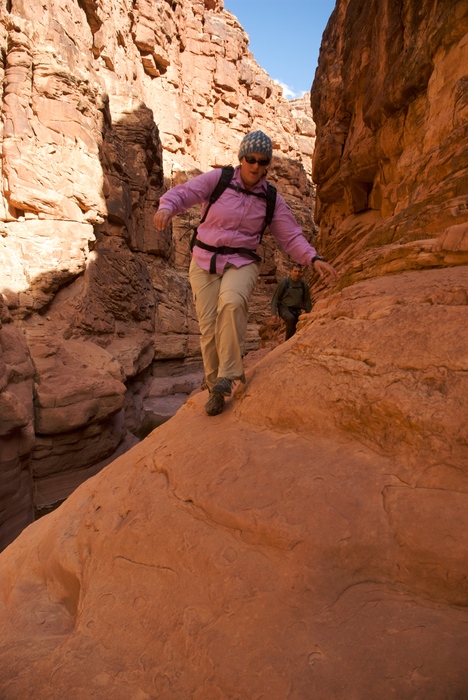 Liz has no problem with the sketchy, sloped ledge walk. A fall here would hurt...a lot.