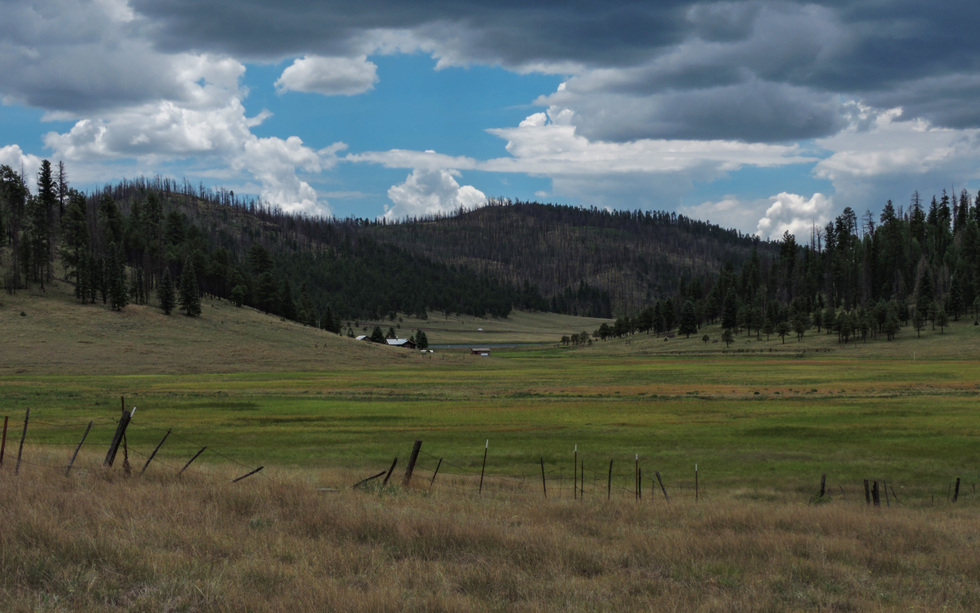 Small valley near the upper end of Boneyard Canyon where the Sierra Blanca Ranch is located. The ranch has a small reservoir which appeared to be full.