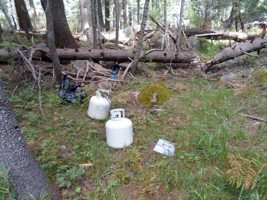 Both tanks were nearly full. Frying pan and other pots and pans. Same blue enamel coated cookware found downstream by Larson ridge.