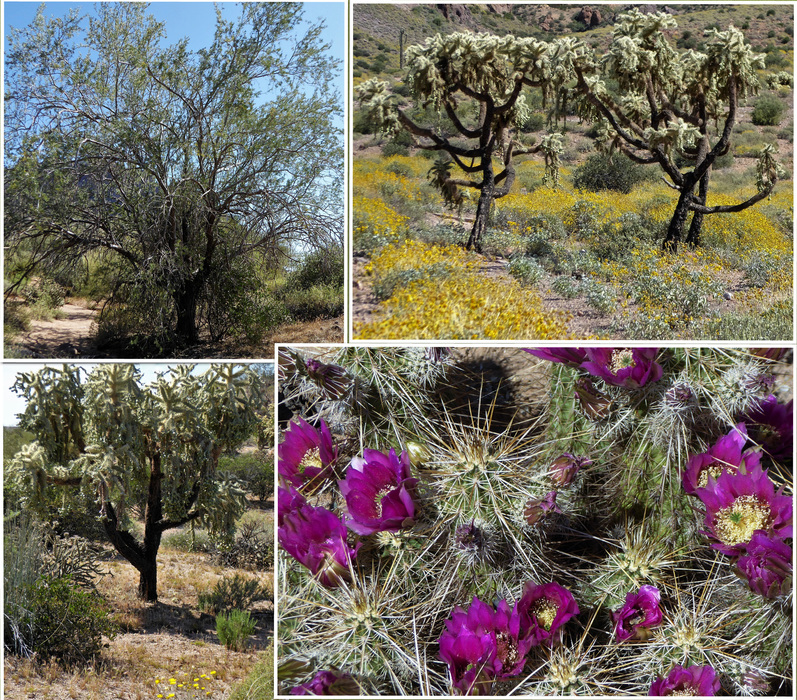 Some of the flora: Ironwood tree, cholla trees and blooming hedgehogs.