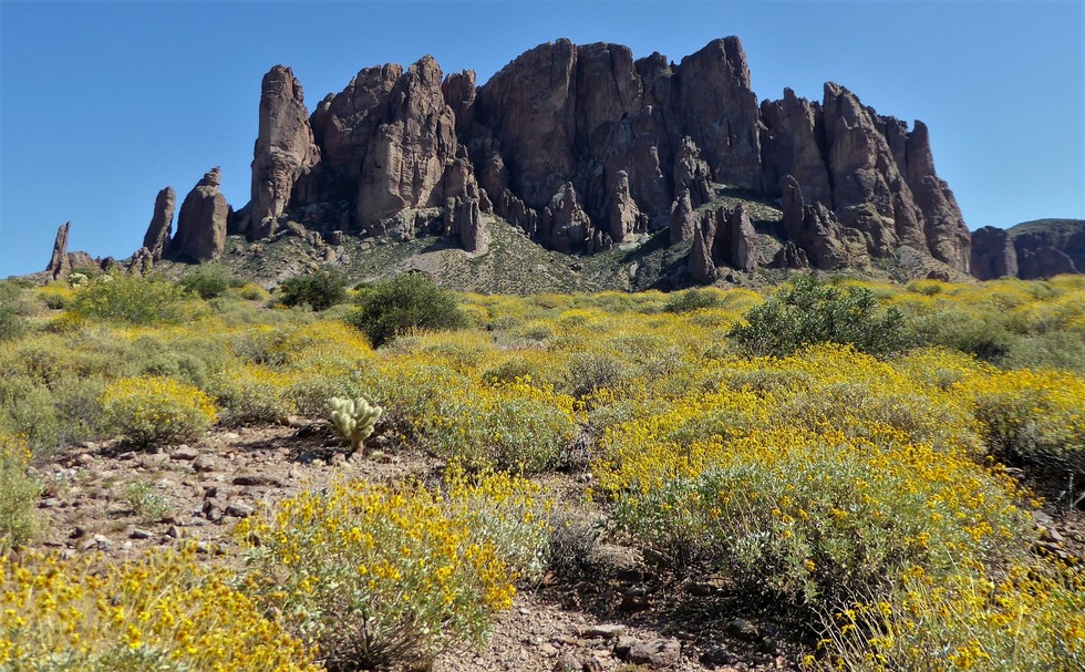Once again, the waning bloom of the brittle bush makes for a nice gold carpet spread out below the western Superstition massif.