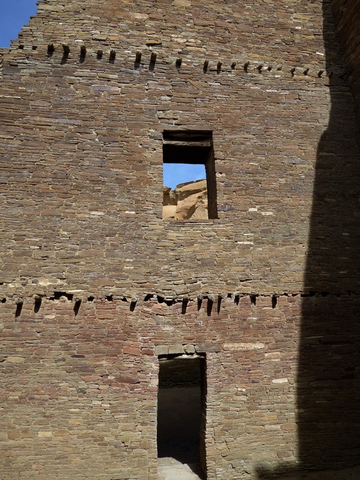In this room you see the remnants of original plaster, as well as primary and secondary roofing beams. The vigas (primary beams) carry the weight of the roof. The latillas (secondary beams) were laid perpendicular to the primary beams. These floor and ceiling systems were about a foot thick.
