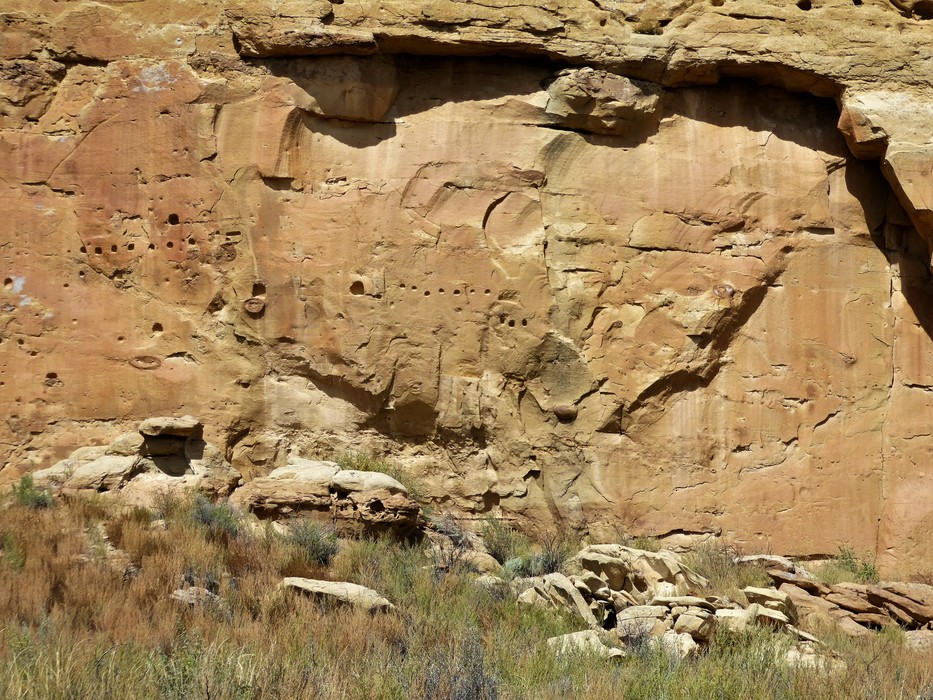 See the numerous circular sockets. Many are spaced at regular intervals. These shallow, pecked depressions supported the wooden roof and floor beams of smaller buildings. The canyon served as a back wall for these structures. They were an integrated part of the architectural complex at Chetro Ketl. chacoarchive.org/cr ... etl/
