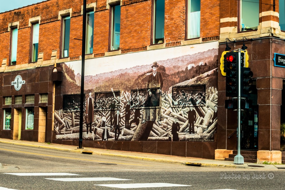 A large photo replica mural showing an actual log jam on the St. Croix river decorates a store along the main street