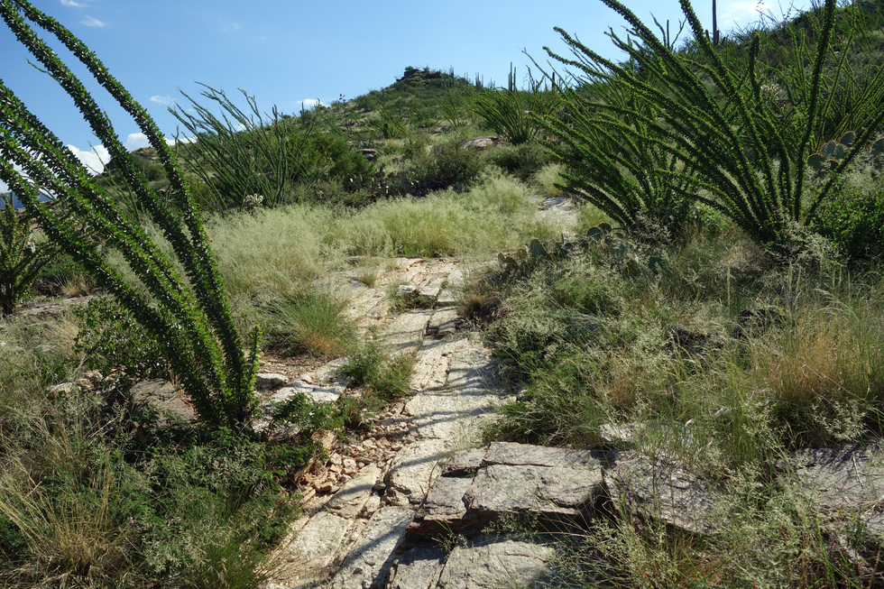 Does anyone know what the most predominant grass is? Lehmann Lovegrass. Like buffelgrass it was brought here from Africa for reasons to do with livestock. These grasses crowd out and compete with natives for resources and create fuel for fires that the native sonoran desert plants are just not adapted to survive. Since the non-native grasses are doing great after a fire, eventually they take over.