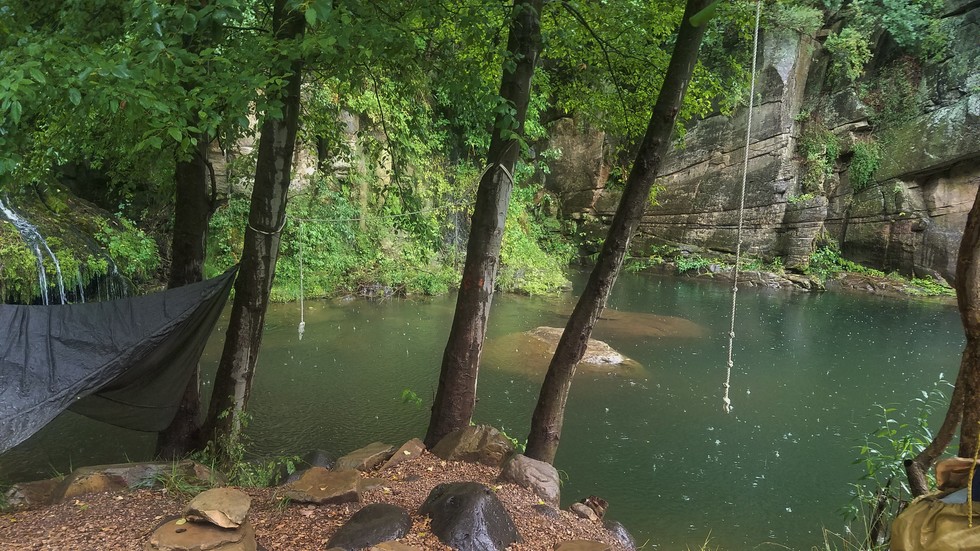 New annual tradition.... with full pack on, swing off the rope to take in the chill for the journey out. Might as well get used to the cold water early on.
