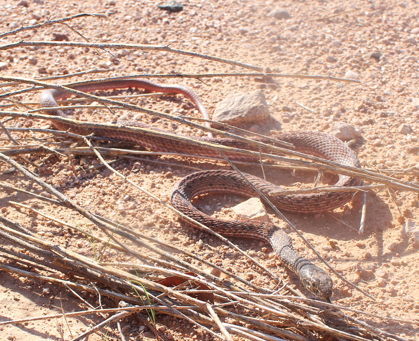 I'm not 100% sure this is the same coachwhip that I saw yesterday. It was in the same area and was the same size with a similar look, but I was unable to catch it and got a terrible photo of it before it got away. It looks a little different (but I could be wrong) and behaved differently, so I'm guessing that it's not the same one from yesterday.