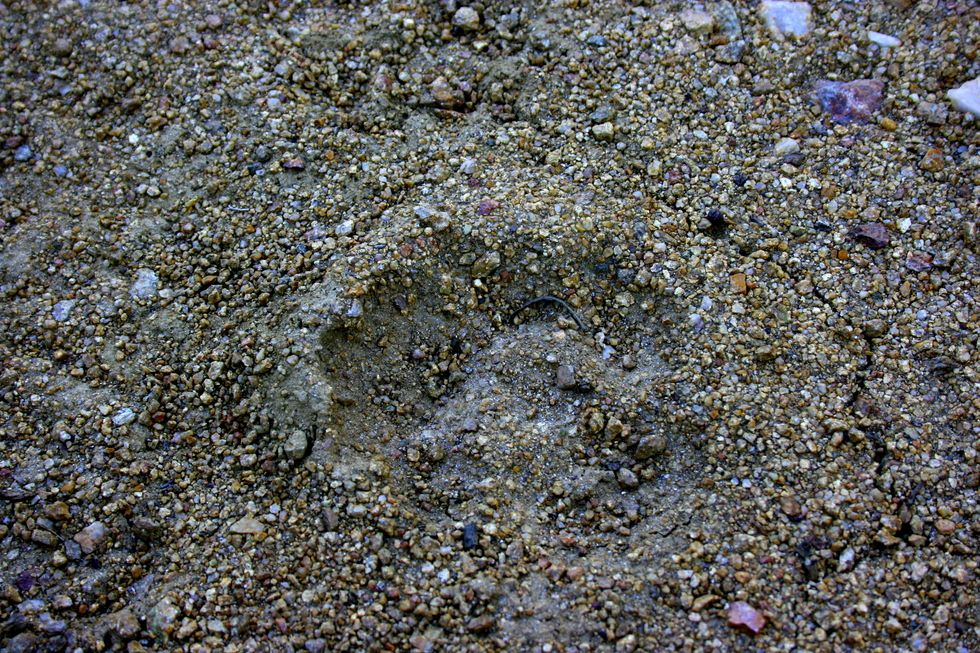 Looks like a lion track. No claw marks in front, wide heel in the back, and I'm pretty sure it wasn't there when I was heading up. It could be from one of the hounds I heard, but that would be an awfully big hound, and whatever made this was walking. This image is heavily edited (mainly increased contrast).